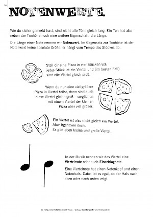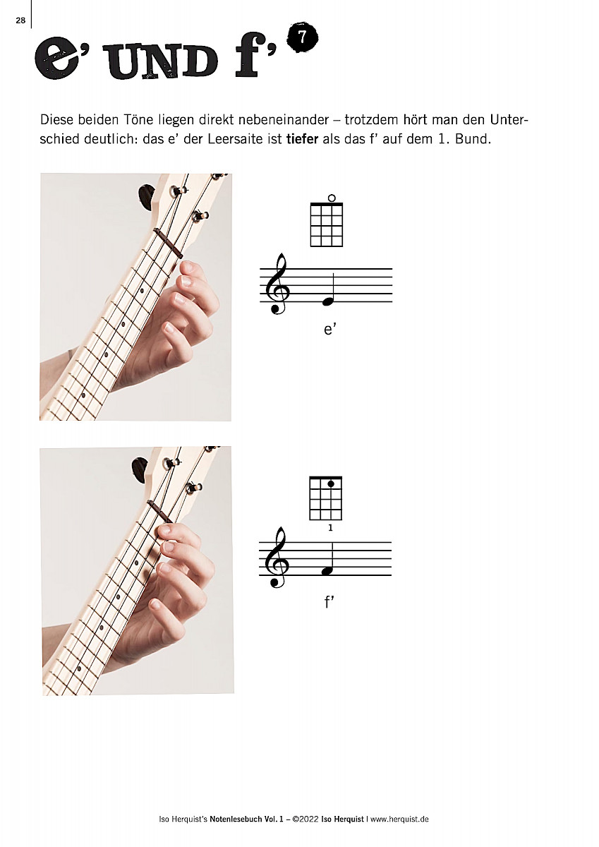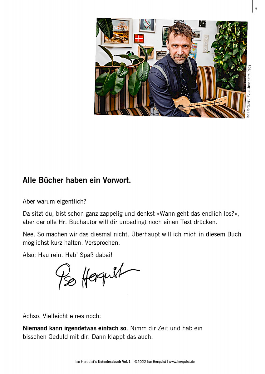 Auf 76 Seiten (A4) lernst du Schritt für Schritt das Notenlesen und vor allem, wie man aus Noten Musik macht. Dabei ist egal, ob du völliger Musikneuling bist oder schon (Akkord-) Spielerfahrung hast. Zu allen Liedern und Übungen gibt es nicht nur Hörbeispiele sondern auch Playalongs. Alle wichtigen Anleitungen zur Spieltechnik sind ausführlich mit Fotos abgebildet.